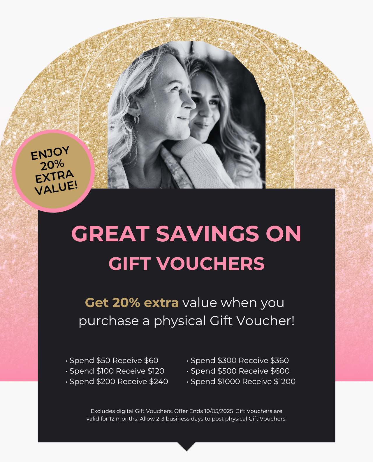 No substitutions. Offer available while stock lasts. Prices are subject to change without notice. *20% bonus deal valid for physical Gift Vouchers only. Excludes digital Gift Vouchers purchased online.